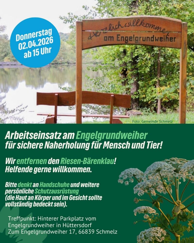 OV Schmelz – Arbeitseinsatz Bitte denkt an Handschuhe und weitere persönliche Schutzausrüstung (die Haut an Körper und im Gesicht sollte vollständig bedeckt sein). Donnerstag02.04.202615:00 – 15:00 UhrEngelgrundweiherZum Engelgrundweiher 17Schmelz-HüttersdorfDownload als ics-Datei